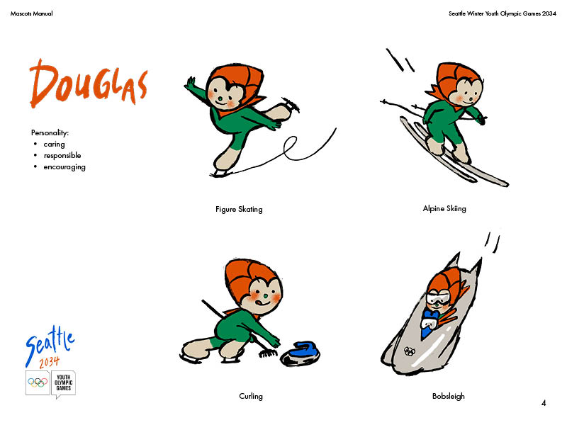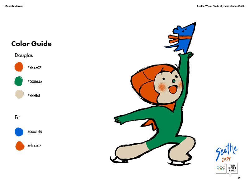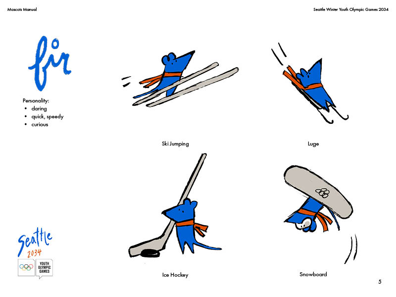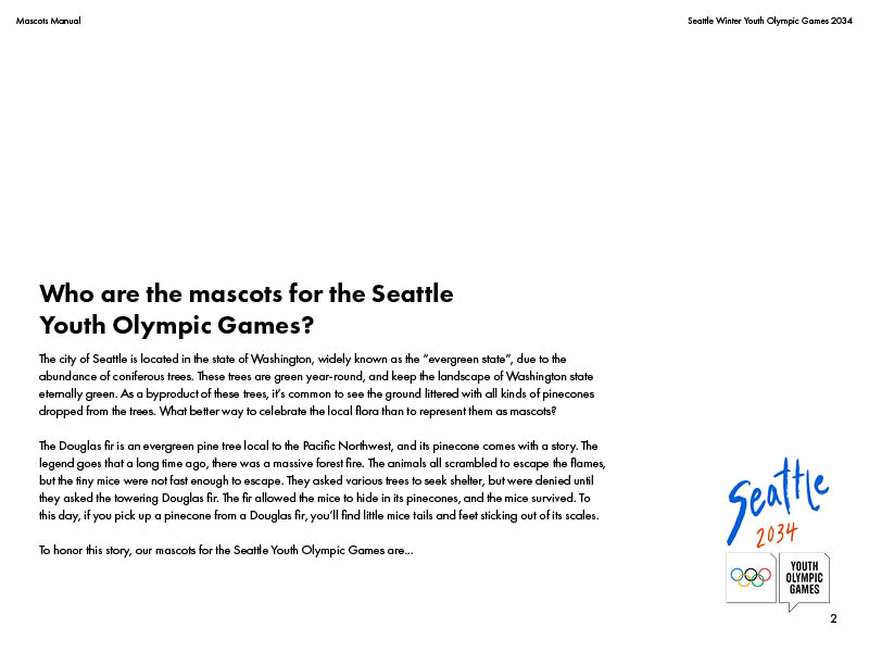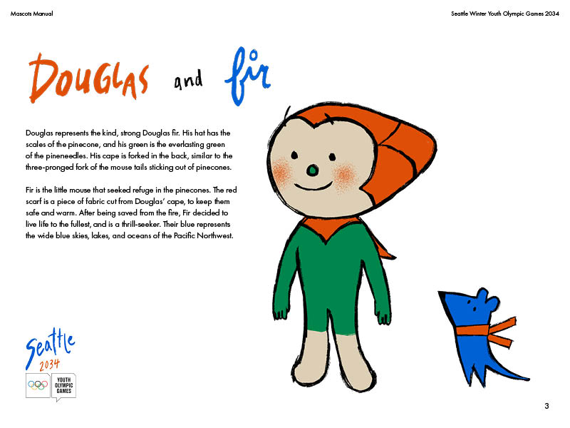 A theoretical mascot manual for the Seattle Youth Winter Olympic Games! Introducing Douglas and Fir, the fun-loving pinecone and mouse duo.